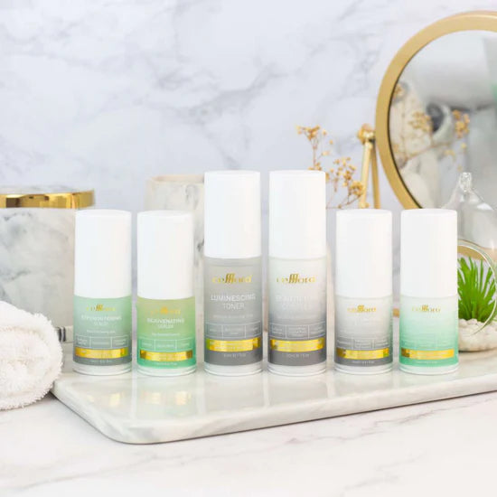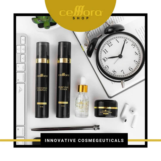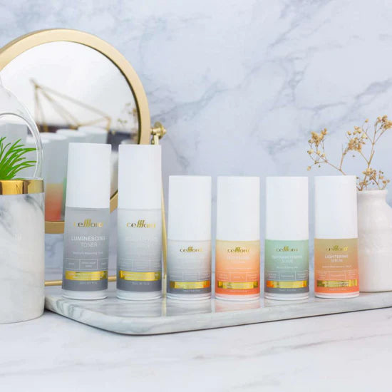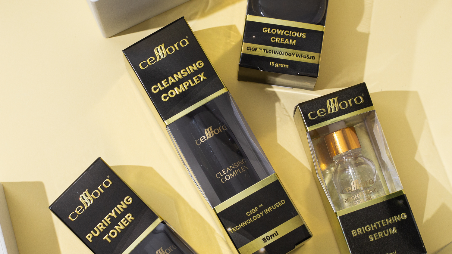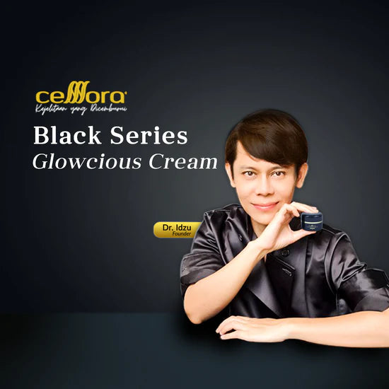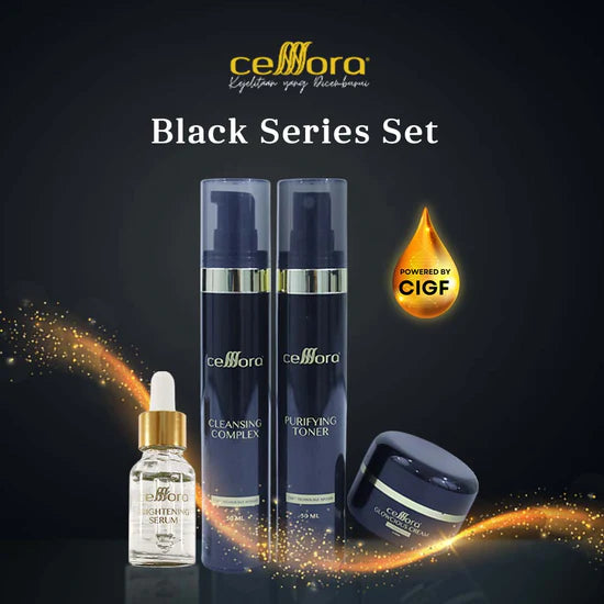 Unlock the power of radiant transformation day and night with Celllora® Black Series set consisting of cleanser, toner, serum and cream.