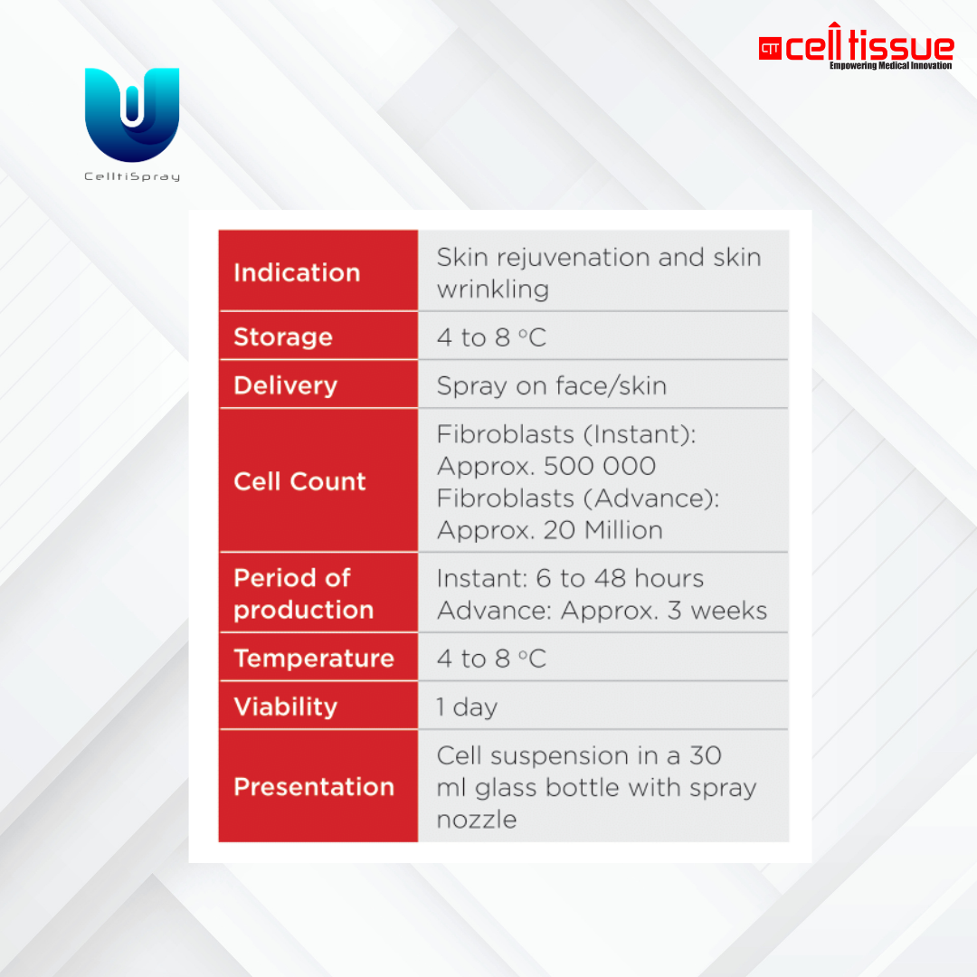 CelltiSpray is an Autologous Dermal Fibroblast in Suspension for aesthetics use. The cell suspension is bottled in a special container with a spray head. A small piece of the client’s skin is harvested through a biopsy. Dermal fibroblast cells are extracted from the skin sample in an sterile environment. The cells are cultured in our state-of-the-art cGMP facility.
