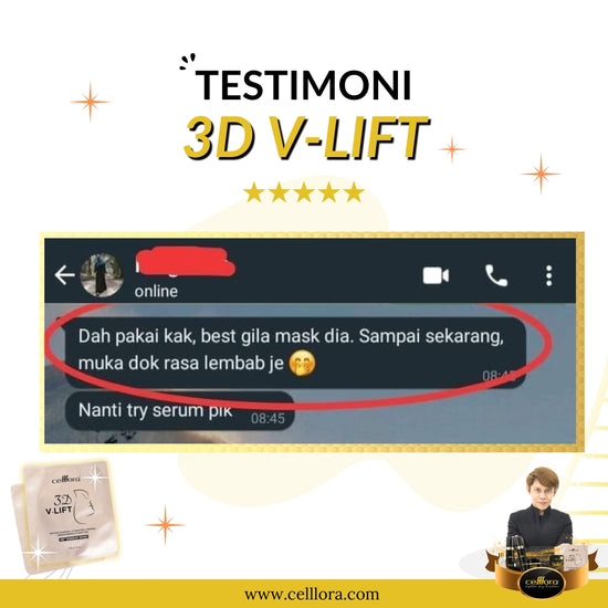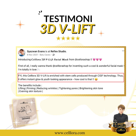 Celllora® 3D V-Lift adalah formula canggih yang menggunakan kehebatan stem sel yang dihasilkan dari teknologi CIGF™️ untuk meremajakan dan menghidratkan kulit. Selain itu, stem cell dapat memberi banyak manfaat seperti anti penuaan, antioksida yang berfungsi sebagai perlindungan dari radikal bebas dan meningkatkan kolagen yang dapat mengembalikan kelembapan, mengurangkan penampilan garis-garis halus dan kedutan serta menjadikan kulit berseri semulajadi.
