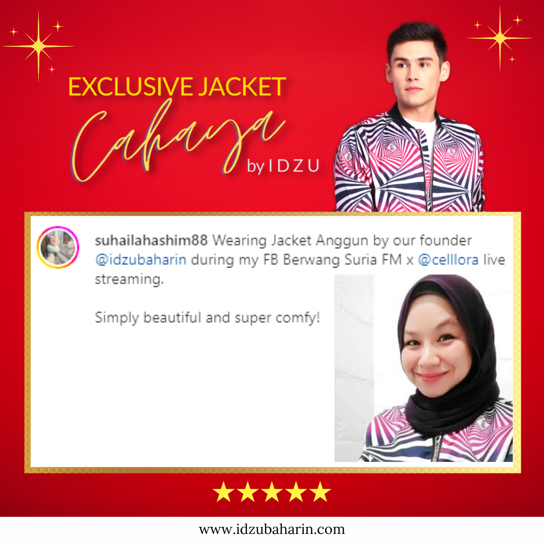 Dressed for the screen, with all the bold and daring colours from our Founder's Exclusive Jacket by Idzu of "Edisi Cahaya". Inspired by the coalescence of red, green and blue light, the basics of light, this must-have, limited collection brings the irresistible, grandiose colour into reality.